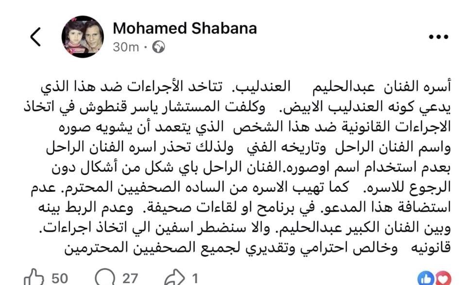 كما حذرت الأسرة الصحفيين ووسائل الإعلام من استضافة “العندليب الأبيض” أو الربط بينه وبين الفنان الراحل، مؤكدة أنها ستلجأ للقضاء في حال استمرار أي استغلال أو تشويه لاسم وسمعة عبد الحليم حافظ.