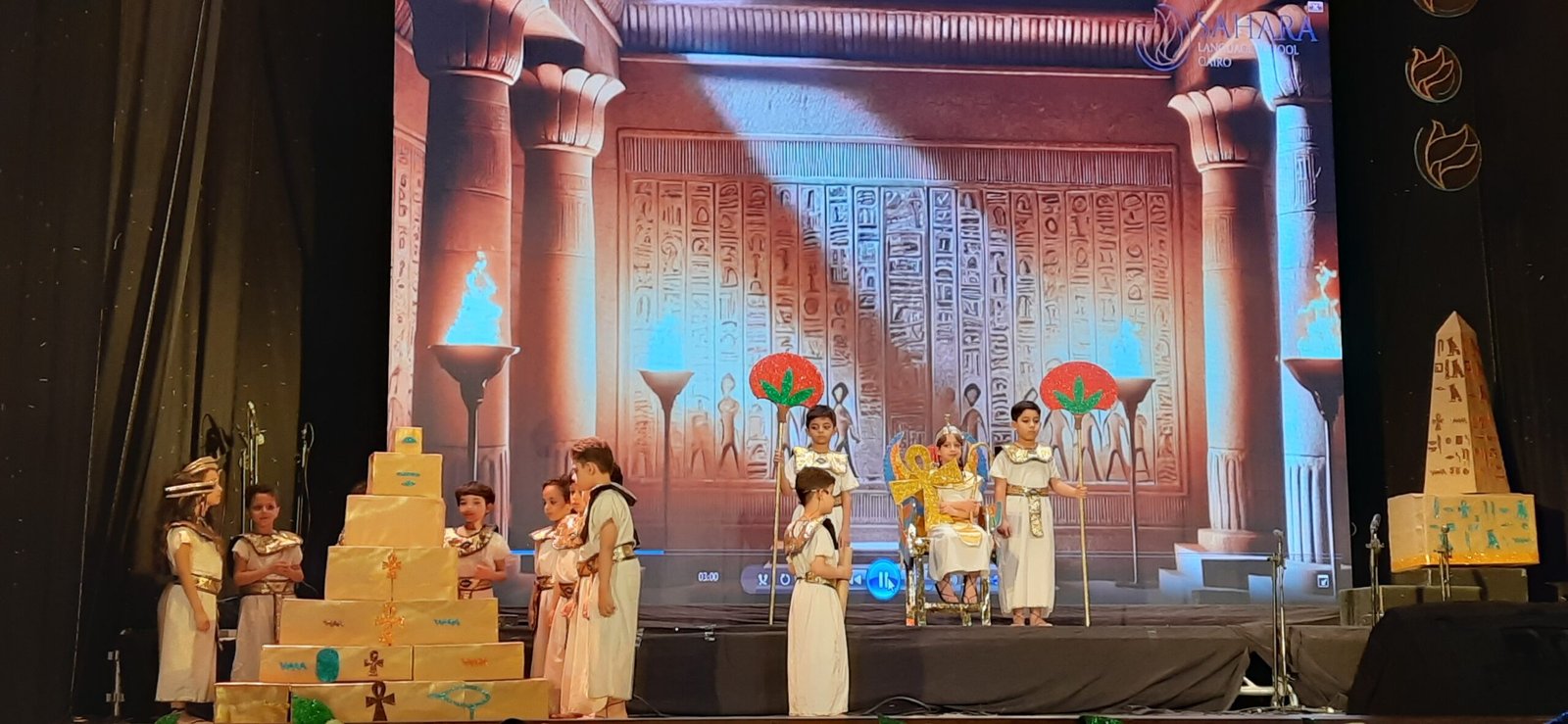 ولم يكن المسرح بعيدًا عن مفردات الحفل، حيث قدّم طلاب “كيجي 1” عرضًا مسرحيًا تمثيليًا مستوحى من حياة الفراعنة وطقوسهم القديمة، مع أزياء فرعونية متقنة وأداء تمثيلي أثار إعجاب الجميع، مؤكدين قدرة الأطفال على التعبير الفني والتفاعل مع التراث المصري بطريقة ممتعة وتعليمية.