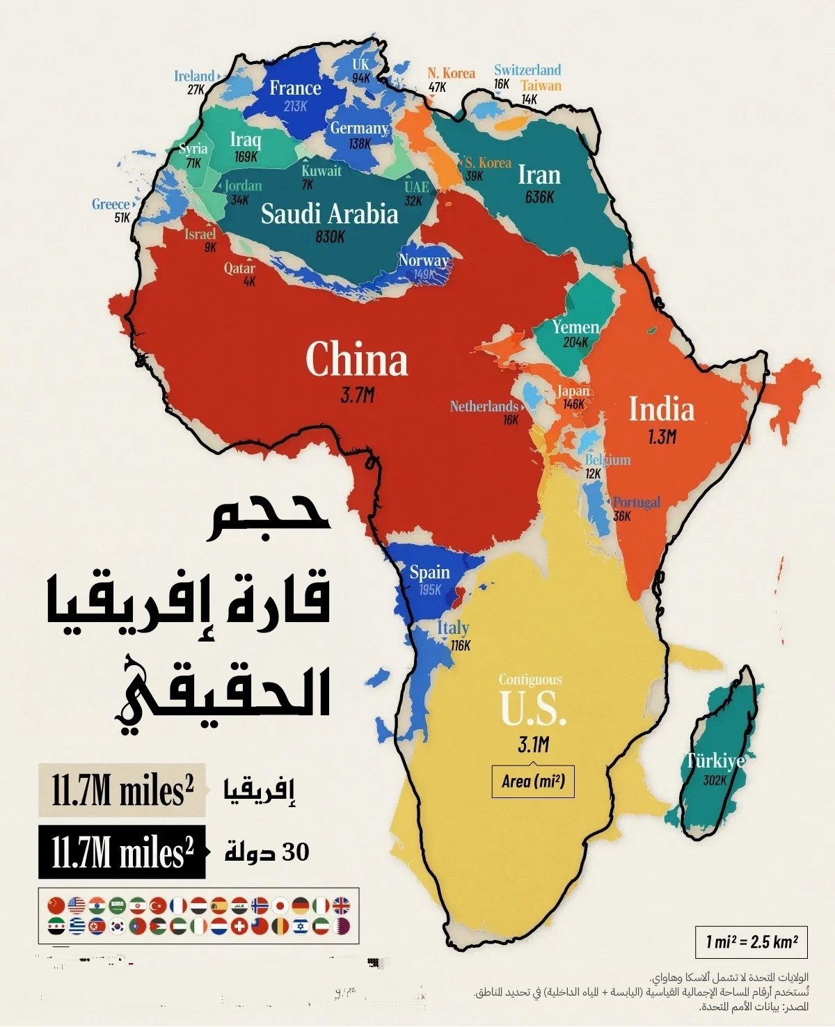 لفهم حجم المأساة، تخيل أن مساحة أفريقيا الحقيقية تبلغ 30.4 مليون كيلومتر مربع. هذه المساحة الشاسعة يمكنها أن تستوعب بداخلها مساحة كل من الولايات المتحدة، الصين، الهند، اليابان، وأغلب دول أوروبا مجتمعة، ولا يزال هناك متسع! فالقارة الأفريقية هي ثاني أكبر قارات العالم بعد آسيا.