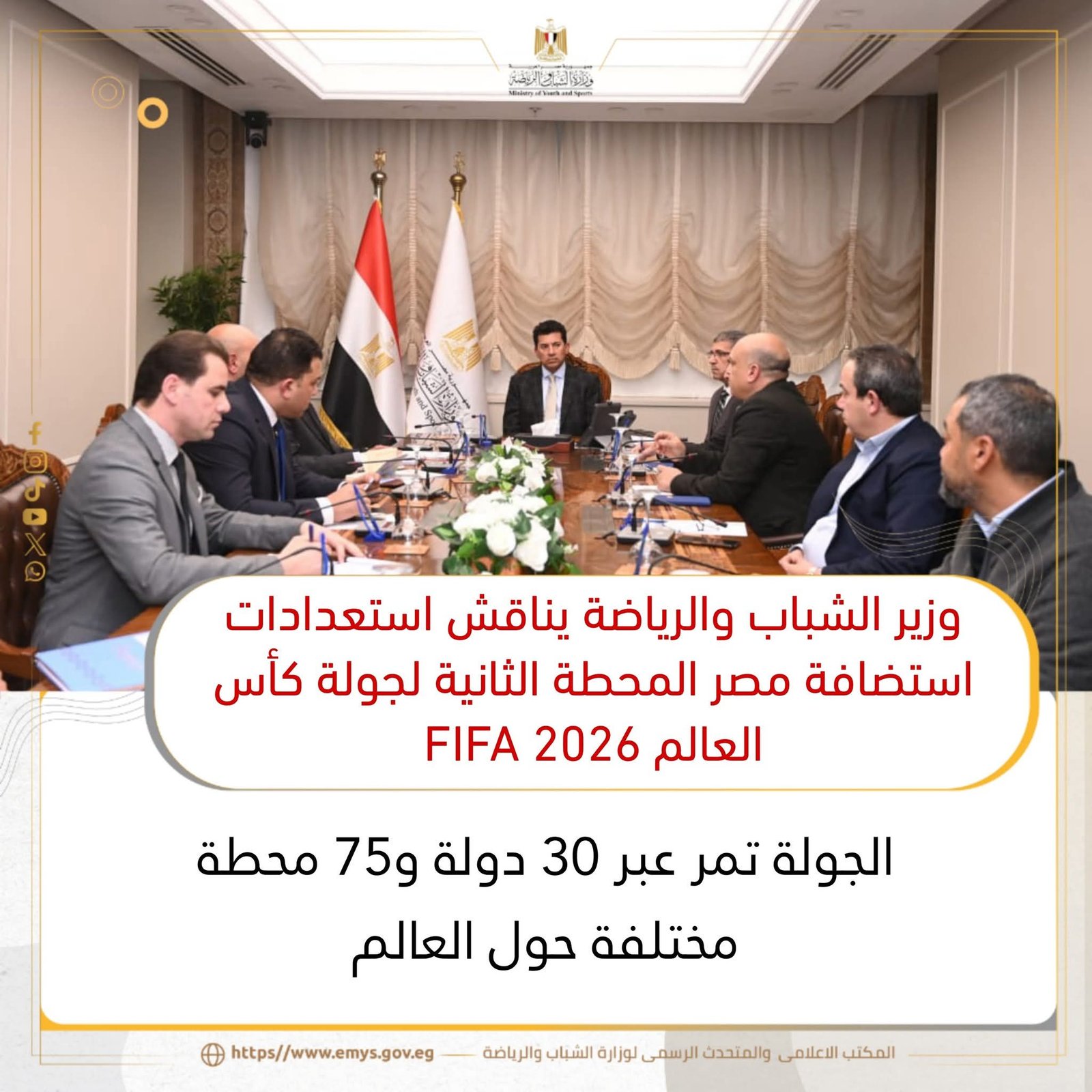 السياحة الرياضية في خطوة تعكس ثقة المنظمات الرياضية العالمية في القدرات المصرية، ناقش الدكتور أشرف صبحي، وزير الشباب والرياضة، استعدادات استضافة مصر للمحطة الثانية من الجولة العالمية لبطولة كأس العالم FIFA 2026™. كما تأتي هذه الخطوة عقب انطلاق الجولة رسميا من مدينة الرياض بالمملكة العربية السعودية، كأولى محطاتها، في رحلة تاريخية تمر عبر 30 دولة و 75 محطة حول العالم، حاملة معها الكأس الأصلي للبطولة.