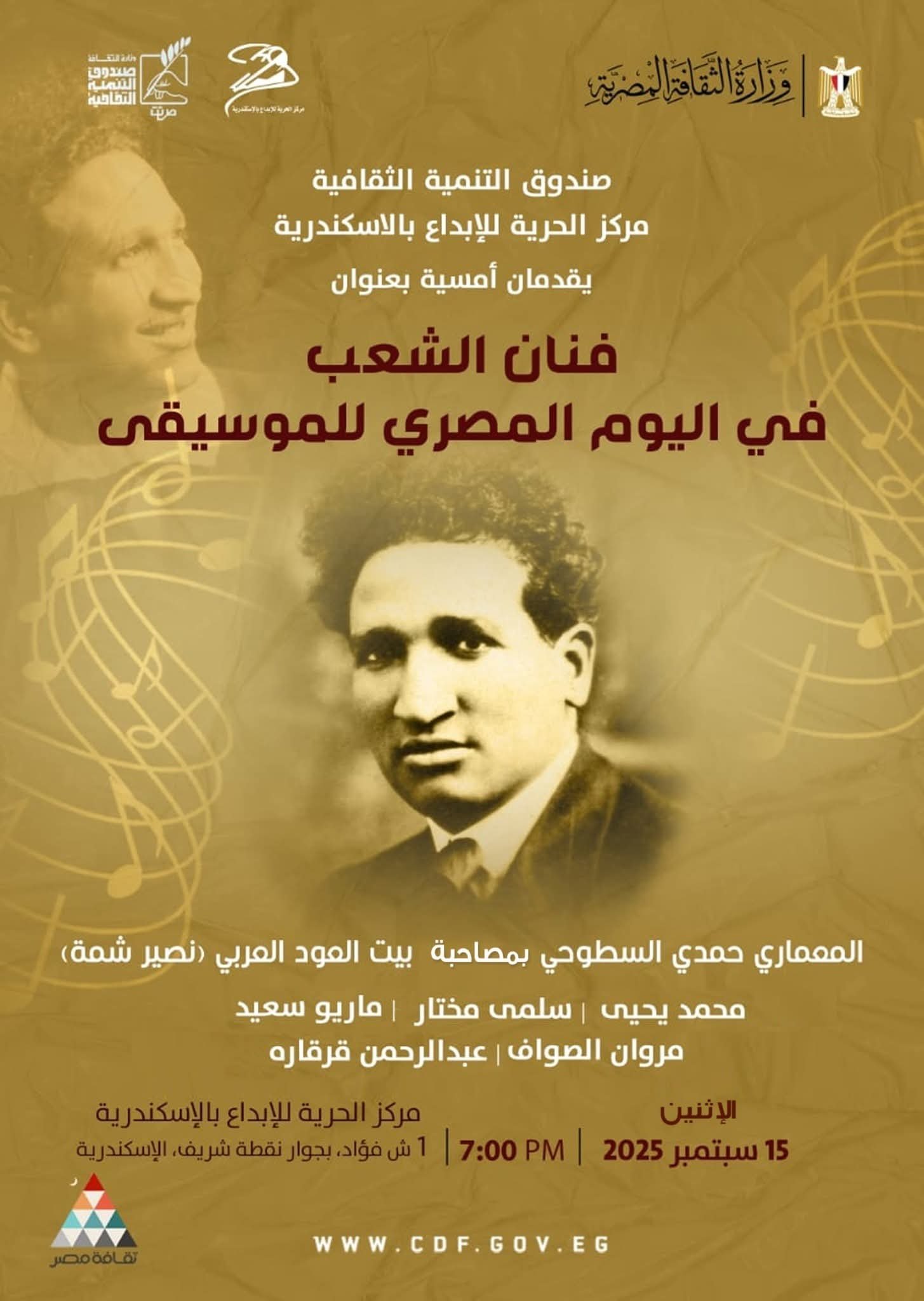في إطار فعاليات اليوم المصري للموسيقى الذي أطلقته وزارة الثقافة المصرية ، ينظم قطاع صندوق التنمية الثقافية من خلال مركز الحرية للإبداع بالإسكندرية أمسية موسيقية–ثقافية خاصة بعنوان “فنان الشعب”، وذلك في السابعة مساء الاثنين 15 سبتمبر، بمقر المركز بشارع فؤاد بجوار قسم العطارين .