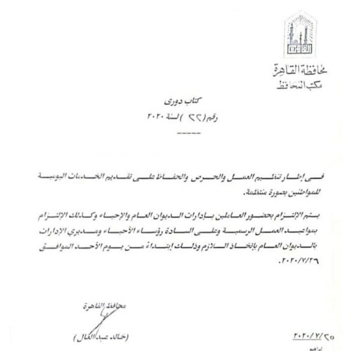 الكتاب الدوري، المرسل لرؤساء الأحياء بشأن أن يتم الالتزام بحضور العاملين بإدارات الديوان العام والاحياء، والالتزام بمواعيد العمل الرسمية، وعلى رؤساء الأحياء ومديري الإدارات اتخاذ ما يلزم وذلك ابتداء من الأحد الموافق 26 يوليو 2020.
