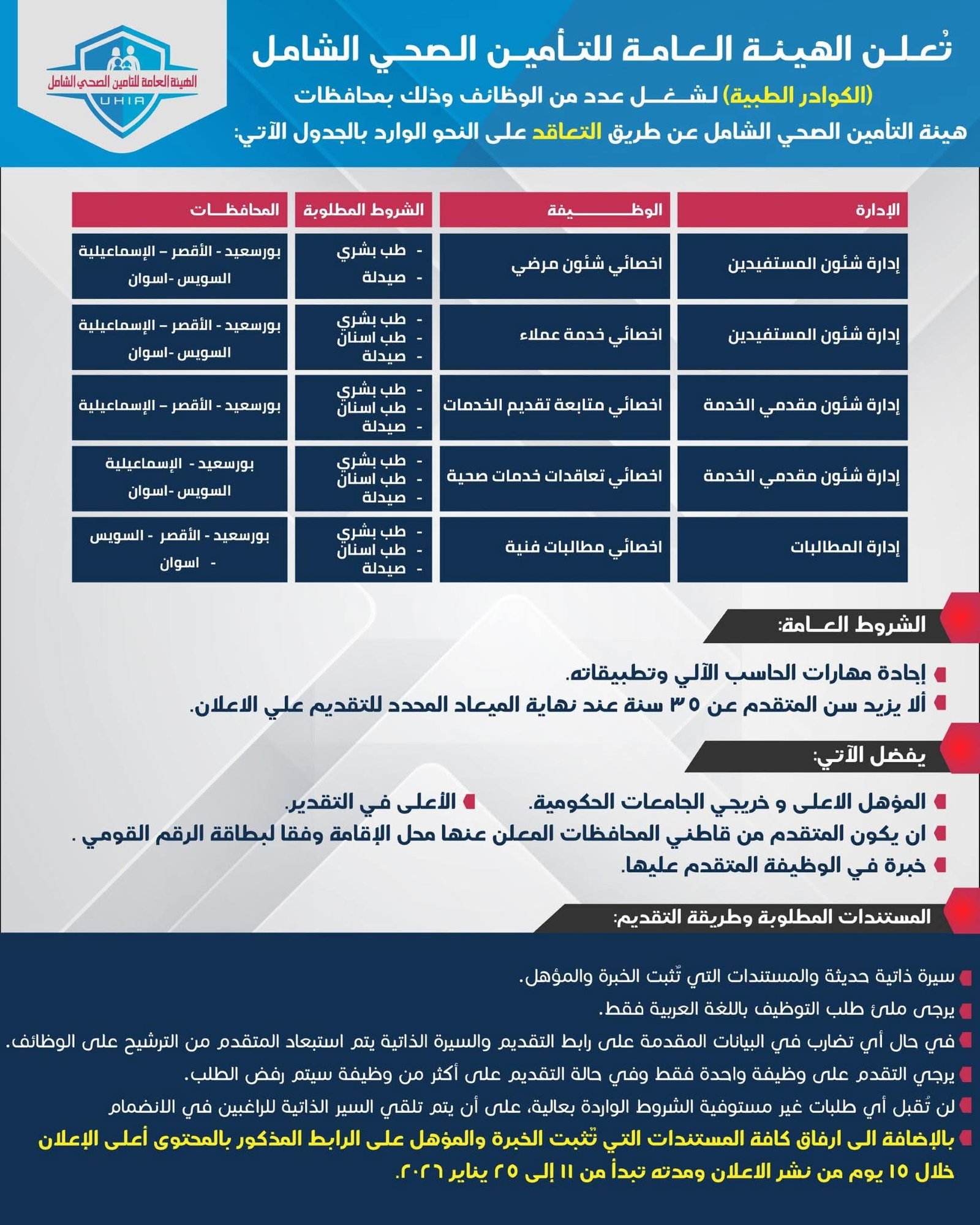كما تمثل هذه الفرصة الوظيفية ليس فقط مسارا للتطور الشخصي للمتقدمين، بل أيضا فرصة للمساهمة المباشرة في مشروع وطني ضخم يهدف إلى حماية الصحة وتخفيف الأعباء المالية عن كاهل الأسر المصرية. وعلى المهتمين التحرك سريعا لإعداد مستنداتهم والتقديم قبل انتهاء المهلة المحددة.
