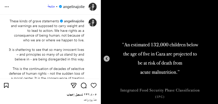 وجهت نجمة هوليوود الممثلة الامريكية انجلينا جولى عدةانتقادات حادة للمجتمع الدولي بسبب الحرب الاسرائيلية المستمرة على قطاع غزة من خلال منشور لها عبر حسابها الرسمي على تطبيق “إنستغرام”