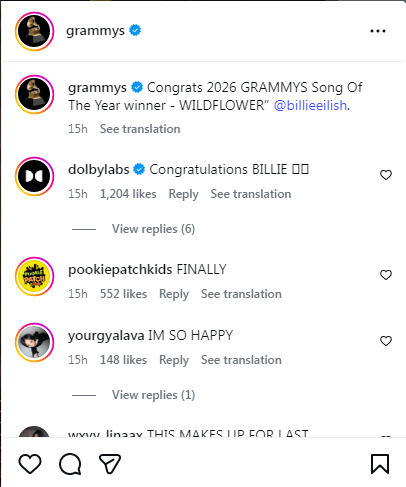 كما فازت أغنية “زهرة برية” لبيلي إيليش بجائزة أغنية العام، وسط خطابات لافتة تناولت قضايا سياسية وإنسانية.