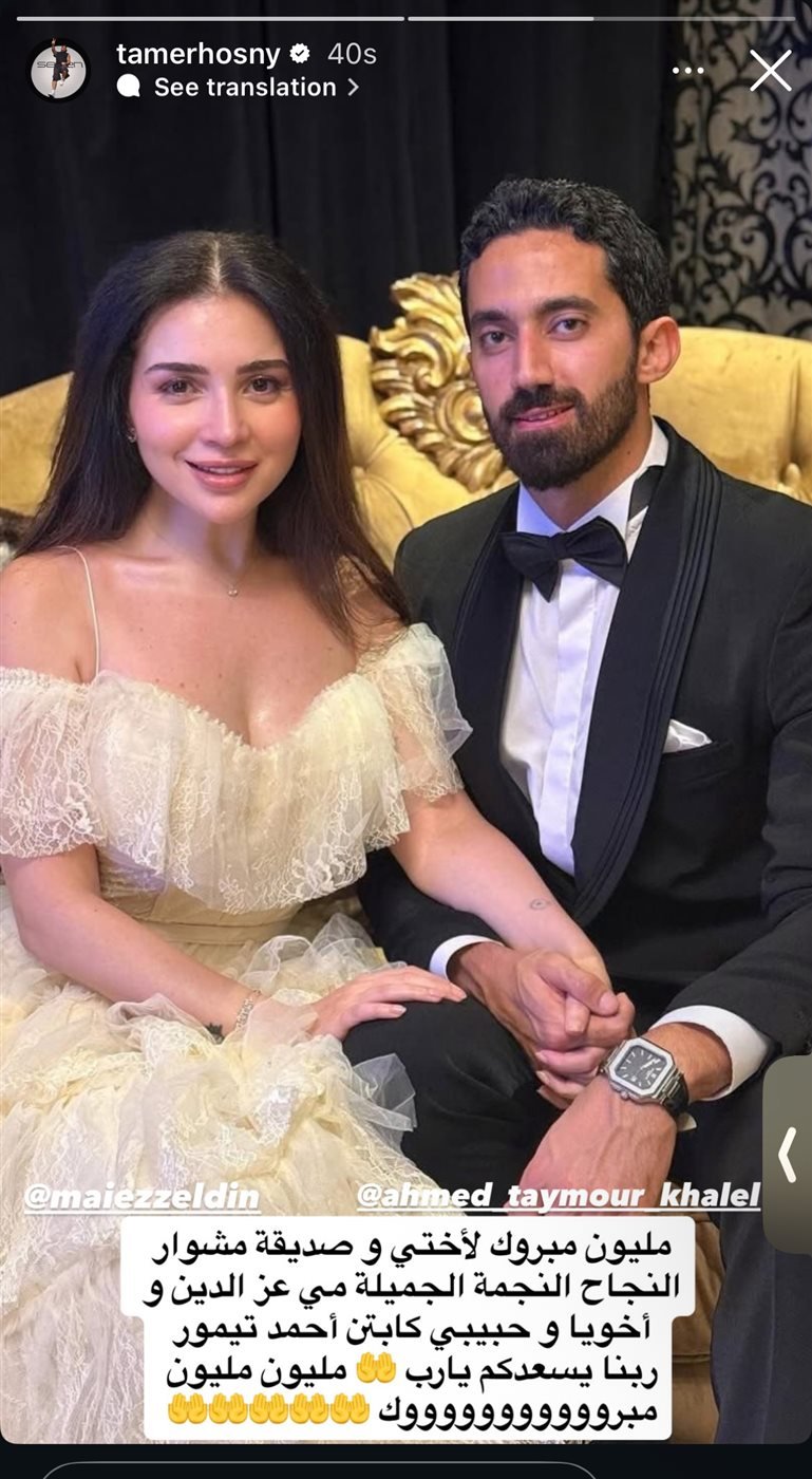 «مليون مبروك لأختي وصديقة مشوار النجاح النجمة الجميلة مي عز الدين، وأخويا وحبيبي كابتن أحمد تيمور، ربنا يسعدكم يا رب، مليون مبروك».