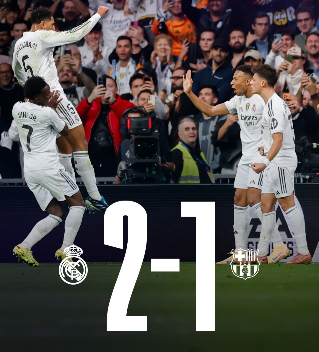 وقبل نهاية الشوط الأول بدقيقة واحدة، أعاد المتألق جود بيلينغهام التقدم لريال مدريد بتسديدة رائعة من خارج المنطقة في الدقيقة 44، هدف منح الفريق الملكي السيطرة المعنوية حتى نهاية اللقاء، بعدما حافظ لاعبوه على التقدم في الشوط الثاني رغم محاولات برشلونة للعودة.