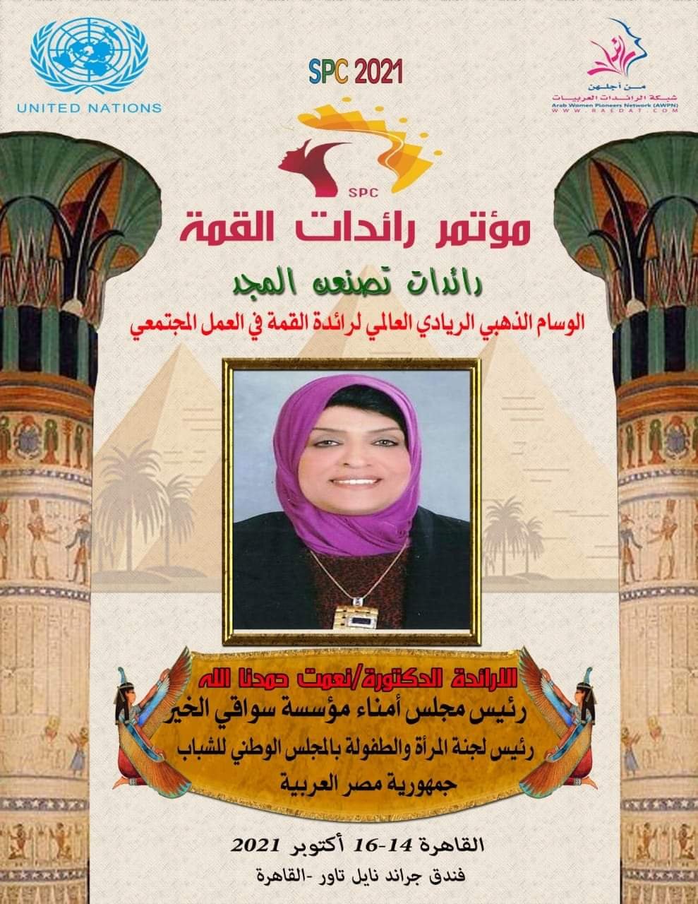 ومن ضمن تكريم الرائدات من جمهورية مصر العربية الدكتورة نعمه حمدناالله رئيس مجلس امناء مؤسسة سواقي الخير ورئيس لجنة الامومة والطفولة بالمجلس الوطني للشباب وبالحديث مع الدكتورة قالت…