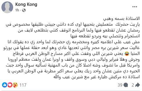 وفي منشور عبر حسابه الرسمي على موقع «فيس بوك»، وجّه محمد عبد الوهاب رسالة مباشرة إلى بسمة وهبة، اتهمها فيها بعدم المهنية، والتدخل في شؤون شيرين الخاصة.
