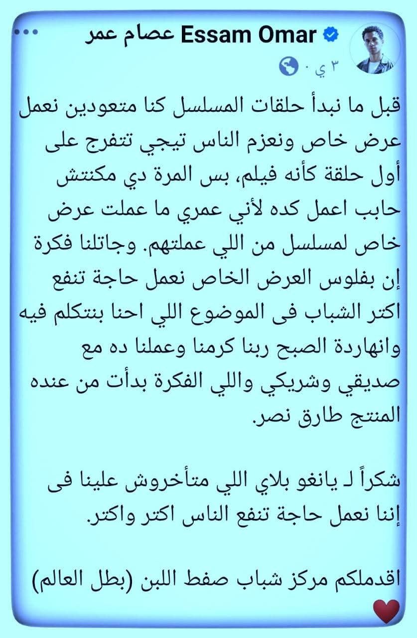 في خطوة تجسد التكامل بين الفن والواقع، وتحول الشاشة إلى فعل تنموي ملموس، قدم الفنان عصام عمر نموذجا فريدا للمسؤولية الاجتماعية، حين استبدل العرض الترويجي لمسلسله الجديد “بطل العالم” بمبادرة هادفة لدعم مركز شباب صفط اللبن، وهو ما لاقى ترحيبا وتقديرا رسميا من وزارة الشباب والرياضة.