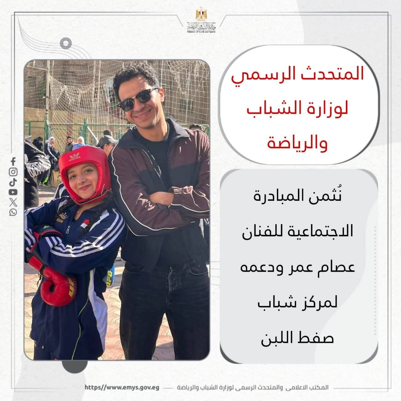 كما أكد المتحدث الرسمي أن وزارة الشباب والرياضة “تشيد بالمسؤولية الاجتماعية التي أظهرها الفنان عصام ” وكافة الشركاء في هذه المبادرة. معتبرا أن “هذا النموذج يعكس التكامل بين الفن والمجتمع، ويسهم في تعزيز قيم المشاركة والانتماء لدى الشباب”.