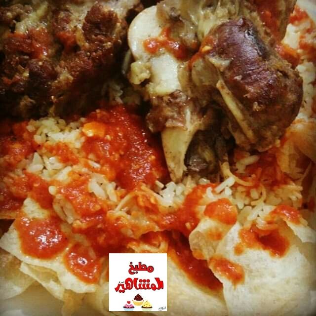 في طبق التقديم يوضع الخبز مع رشه بسيطه من الطشه وملعقه من الصوص ثم نضع الارز واللحم ويزين بباقي الصوص مع الطشه