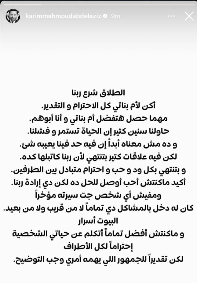 وأضاف الفنان كريم محمود عبد العزيز فى الاستوري (أن الطلاق تم فى أجواء يملؤها الود والحب والاحترام المتبادل بين الطرفين، مؤكدا أنه لم يكن يريد الوصول لهذا الحل إلا أن إرادة الله كانت فوق كل شئ وأضاف مؤكدا أن لا يوجد أي شخص ذكر اسمه مؤخرا، كان له دخل فى هذه المشكلة مطلقا لا من قريب ولا من بعيد ..وان البيوت أسرار.. وانا دائما بحب أحافظ على خصوصية حياتي الشخصية، وما كنتش افضل أتكلم عنها لكن احتراما لكل الأطراف، واحتراما و تقديرا للجمهور اللي يهمه امري كان لابد من التوضيح)