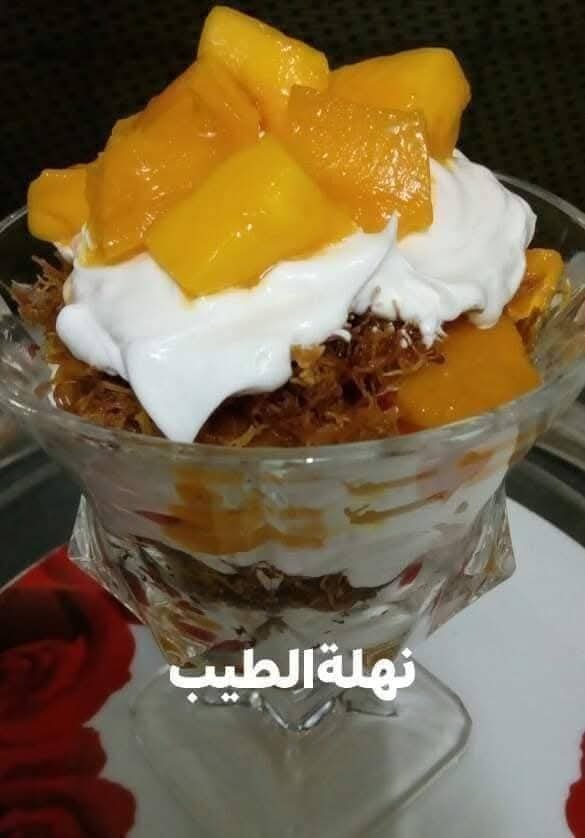 نقطع الكنافة صغير ونقلبها بالسمنة ونحطها بالفرن او تحت الشواية وكل شوية نقلبها لحد ما تحمر نسقيها بالشربات ونرصها في كاسات بالتبادل مع الكريمة والمانجة