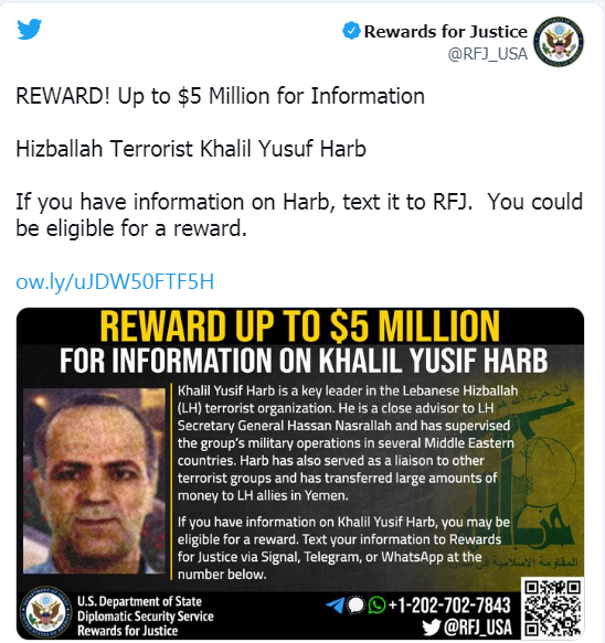أرسل معلوماتك إلى برنامج مكافآت من أجل العدالة عبر تلغرام أو سيغنال أو واتسآب على الرقم الموجود فى التغريدة