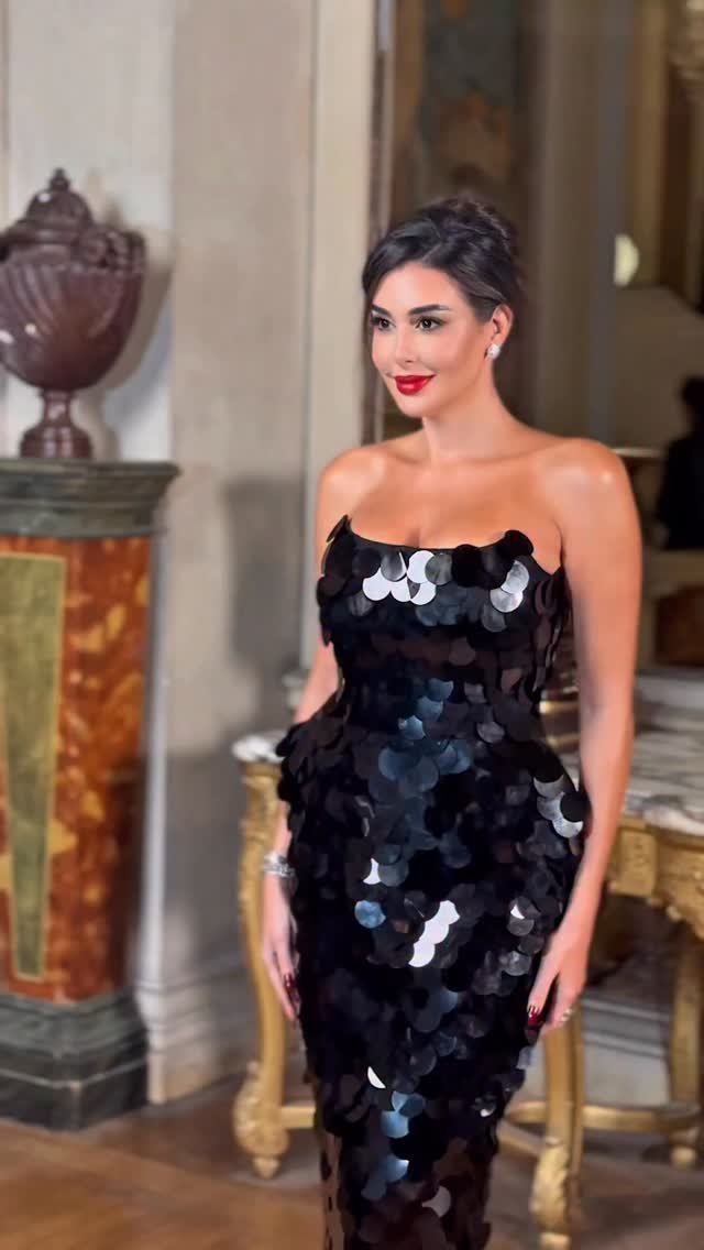 ظهرت ياسمين على منصة العرض مرتدية فستانًا أسود طويلًا مطرزًا بتقنية مبهرة تُعرف بـ”قشرة الأسماك”، عكس بريقًا لامعًا مع كل حركة.